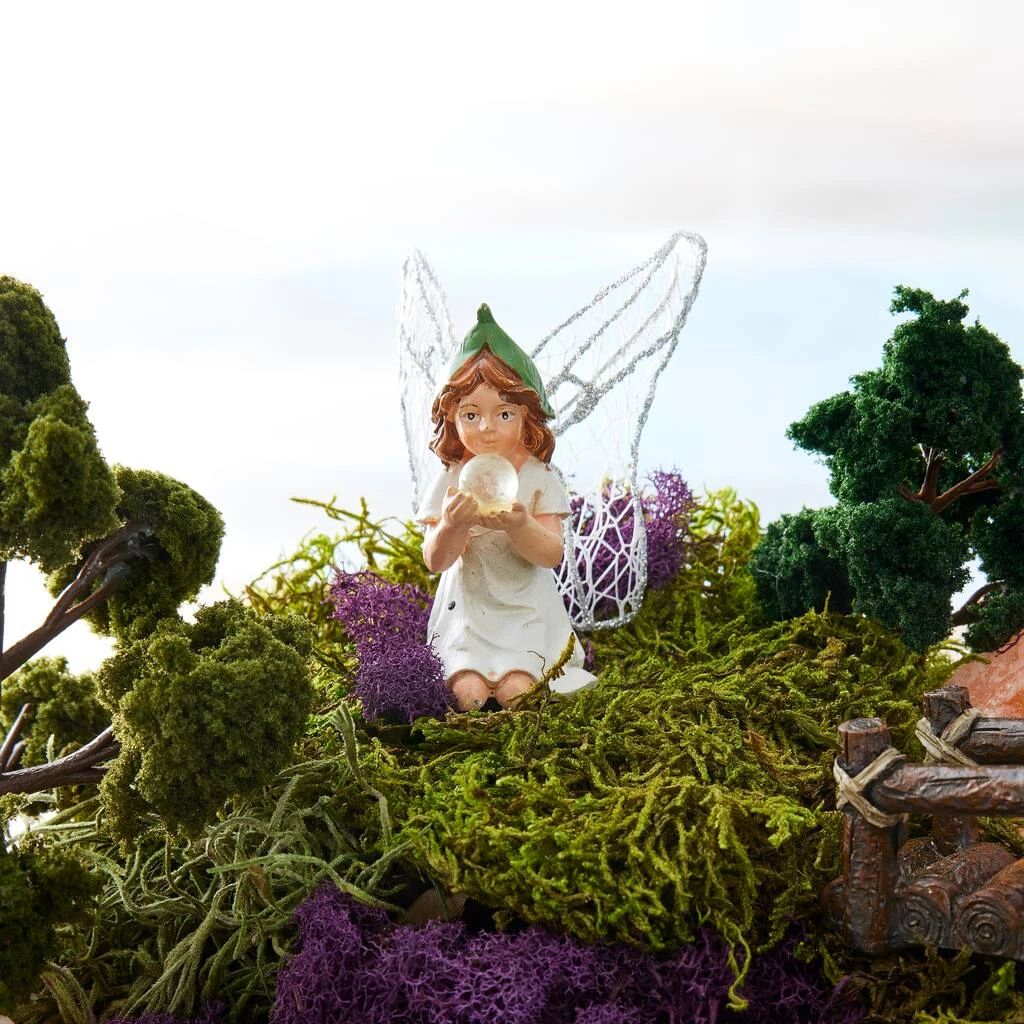 Add charm and personality to your fairy garden with this adorable miniature fairy figurine. Adorned with delicate white wings and enjoying the magic of the glistening water droplet in her hands, this sprite will feel right at home with greenery, friendly critters and another fairy or gnome for company.