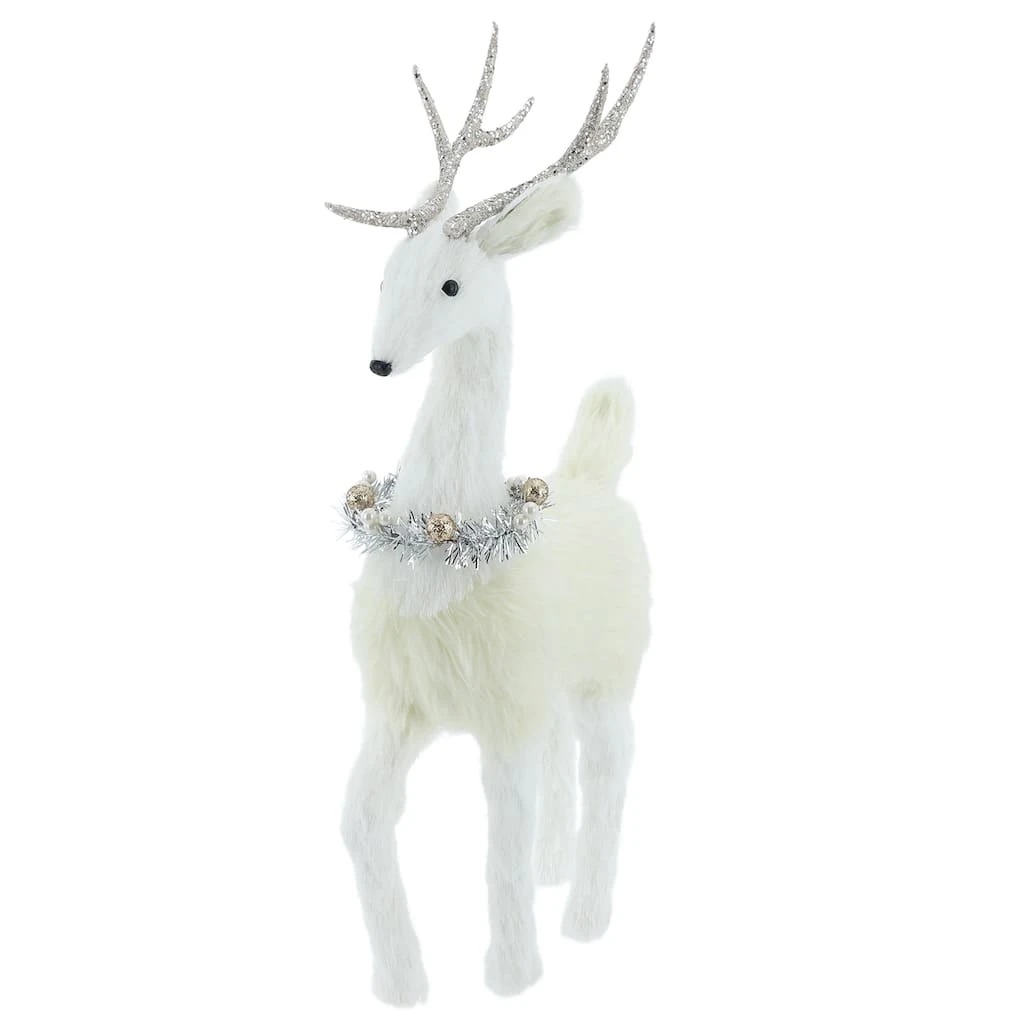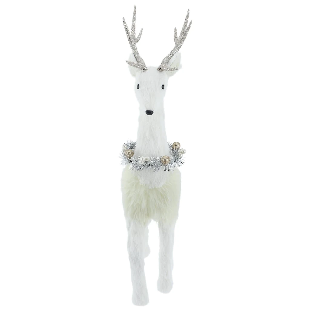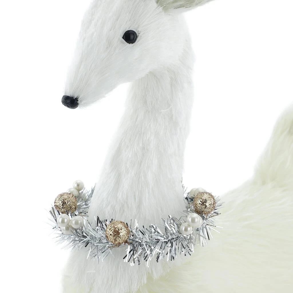 With glittery silver antlers and a wreath of tinsel and ornaments around its neck, this lovely standing deer figurine is sure to bring festive cheer to your home. Display this charming piece alongside a miniature golden tree decked out in sparkly ornaments on your mantel for the holiday season.