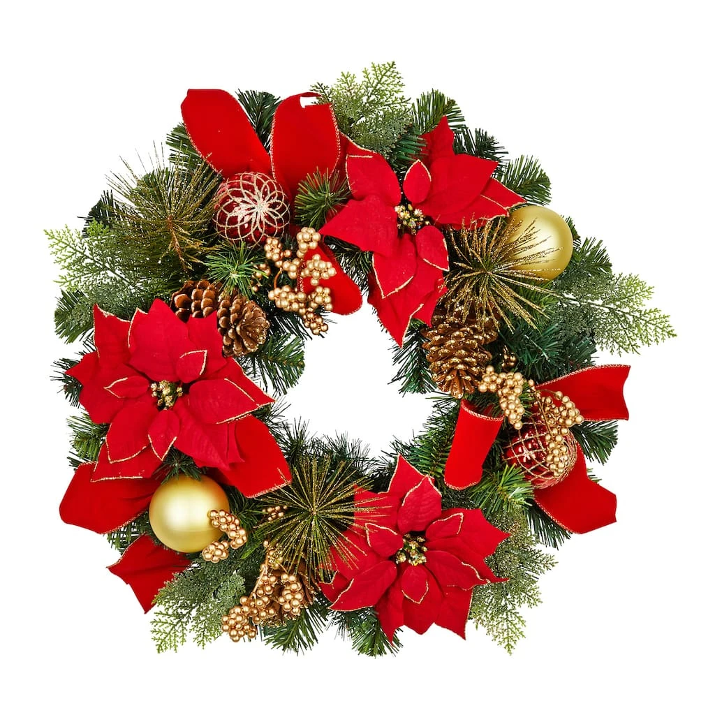 This poinsettia and pine cone wreath is perfect for showing off in your living area. Place it on your wall, window, or mantel to lend your home a festive touch.