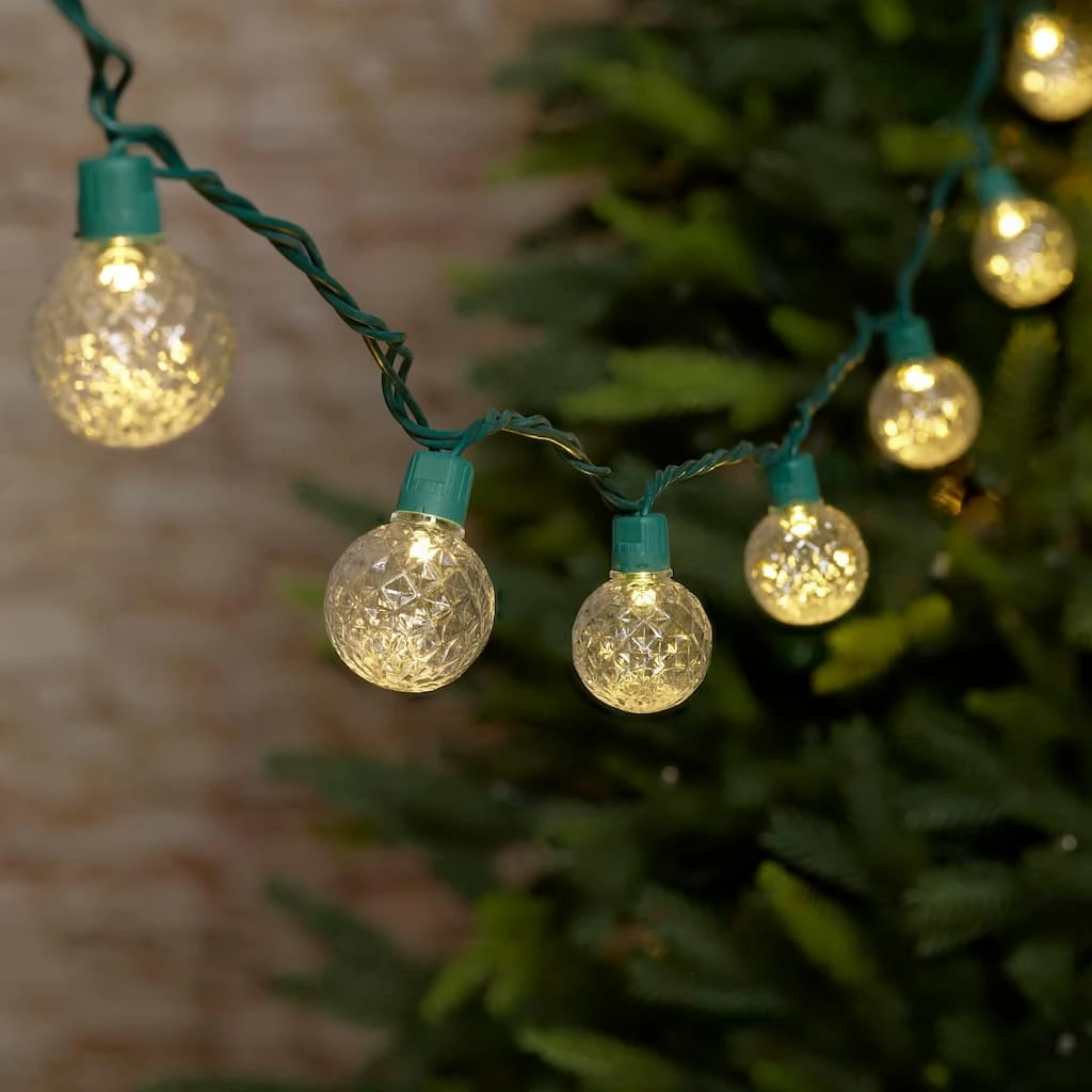 Make the season bright with these festive string lights from Ashland! These diamond cut globe bulbs on a classic green wire can be used both indoors and out and feature a warm white hue. Use to add a twinkle to your holiday tree, intertwine with garland draped along a banister or incorporate into your outdoor décor for an extra touch of the Christmas spirit.