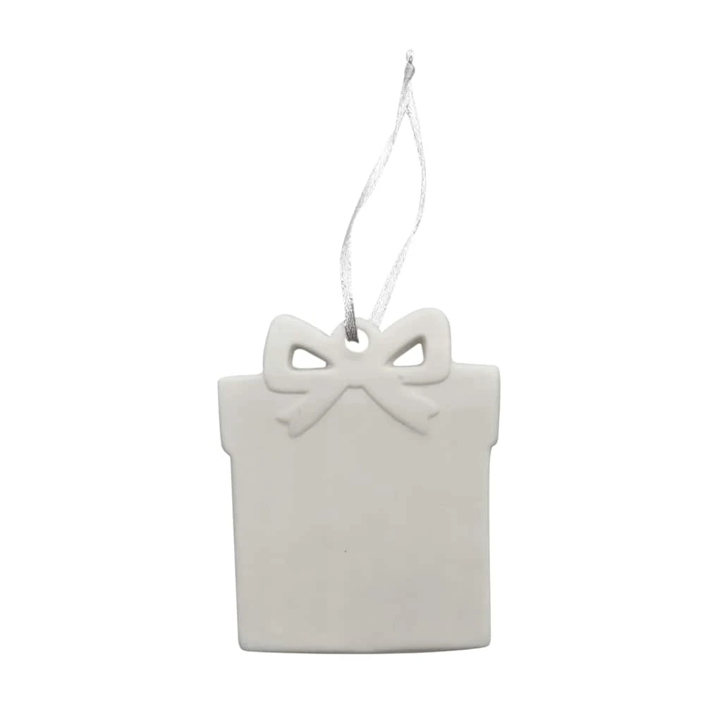 Add your own special flourish to your holiday tree with this unfinished ceramic Christmas ornament, featuring a wrapped present design. Use your imagination to give this piece a fun festive touch using paint, glitter, ribbon and more!