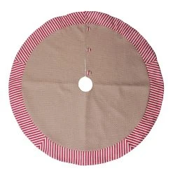 This burlap tree skirt with red and white stripes is guaranteed to complement your tree. Team it with bright ornaments and lights for the perfect holiday display.