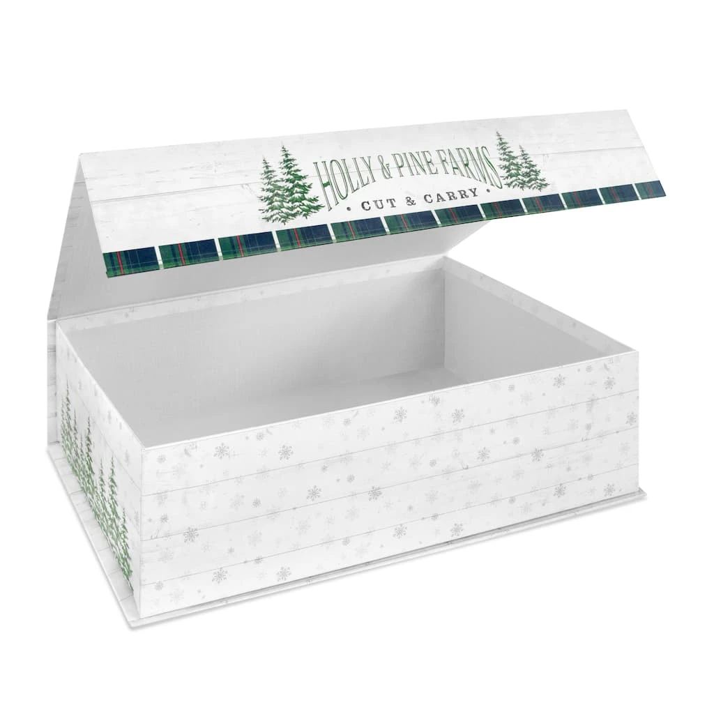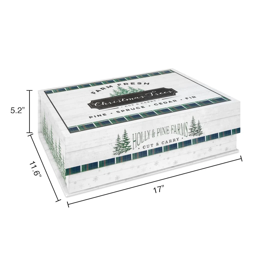 This flip top decorative box is the perfect piece for your home dรฉcor and storage. It features “Farm fresh Christmas trees” and a seasonal design with trees.