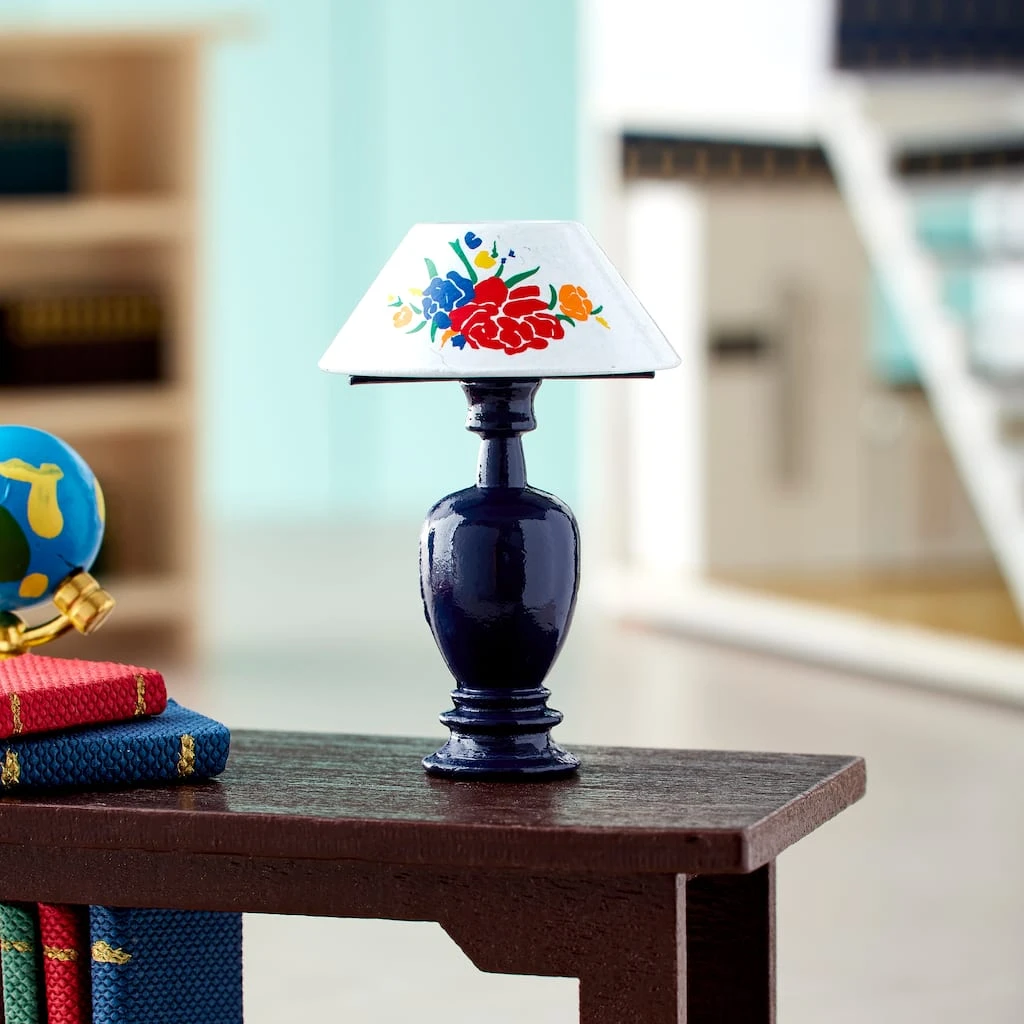 This adorable miniature antique lamp, with a lovely flower patterned shade, will make a wonderful addition to your dollhouse décor. Pair it with a miniature sofa, plants, rugs and other living room accents to complete the display.