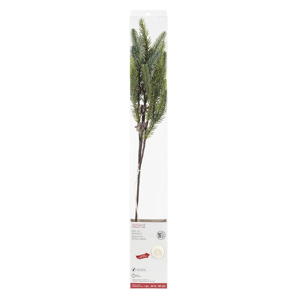 This merry twig with its green pine branches will add some joy to your Christmas decorating scheme. Branches are strung with battery operated warm white lights. This Christmas trimming is perfect for display over doors, windows, fireplace mantels or tabletops, in indoor or covered outdoor locations.