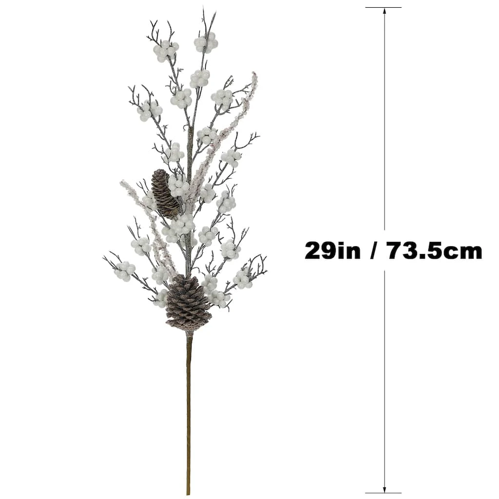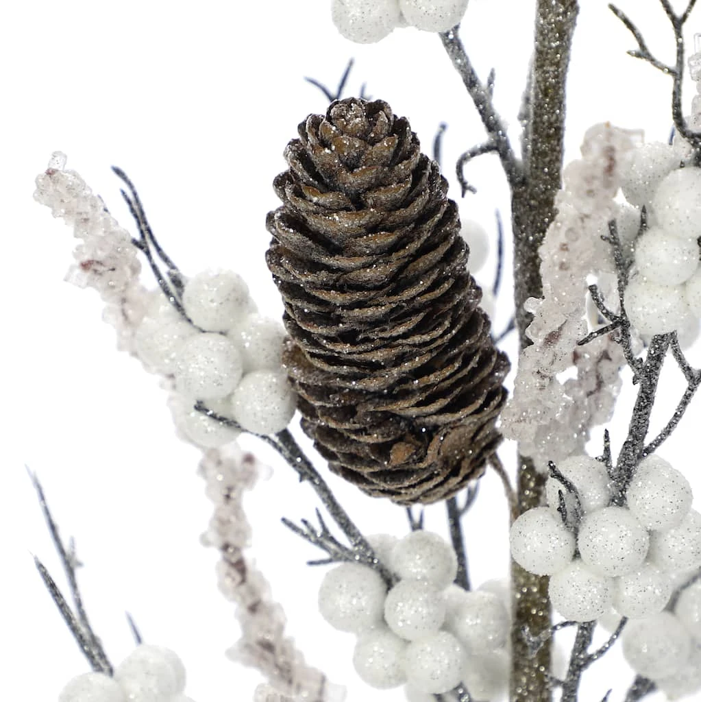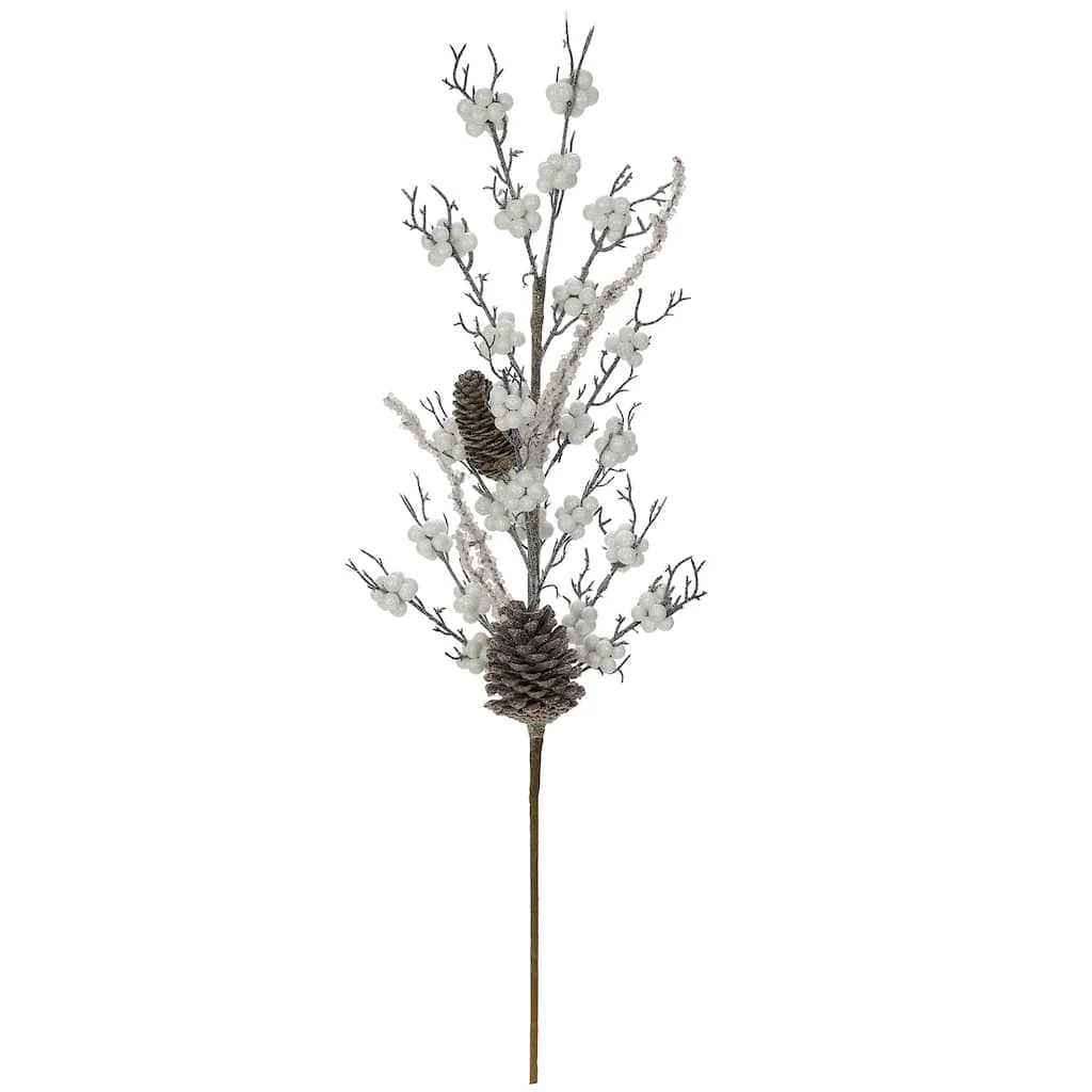 With frosty white berries and a dusting of glitter, this berry and pinecone stem will add a lovely shimmery touch to your Christmas floral projects. Use to bring depth to handmade wreaths and holiday dรฉcor or create a stunning arrangement along with frosted pine stems and brilliant red blooms in a tall vase.