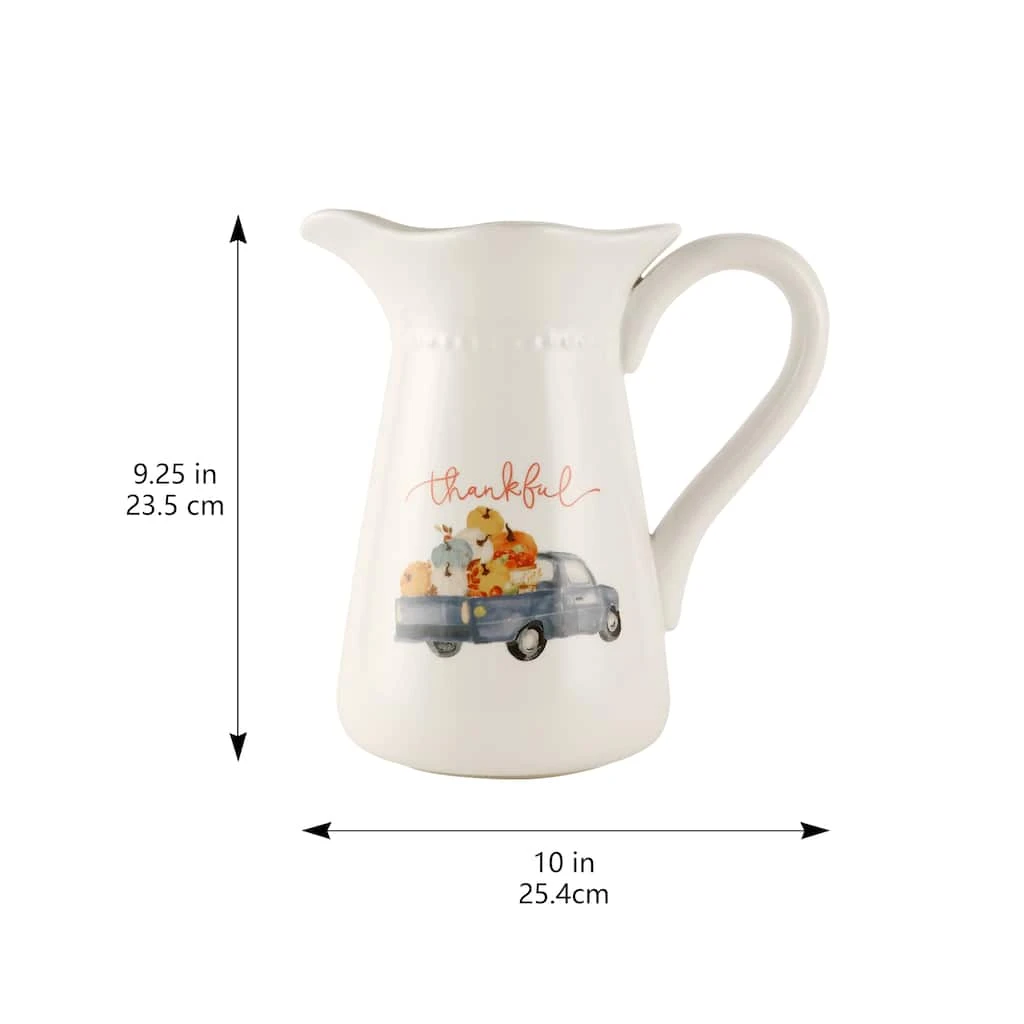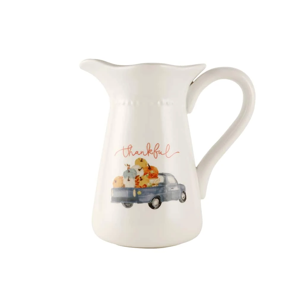 Perfect to add a fall touch to your kitchen, this ceramic pitcher can sit on your counter as décor or be used to serve a drink to your guests. The pitcher says “Thankful” with a cute pick up truck full of pumpkins.